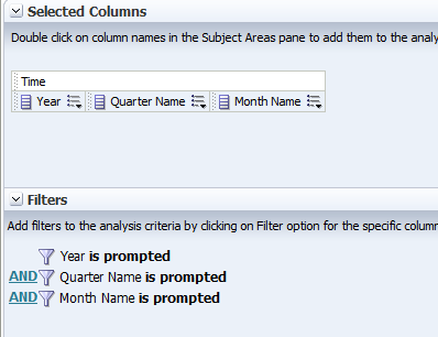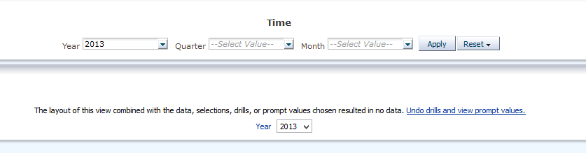 However, after certain changes, you get to the situation where the dashboard will throw the following error : (The layout of this view combined with the data, selections, drills, or prompt values chosen resulted in no data. Undo drills and view prompt values.)