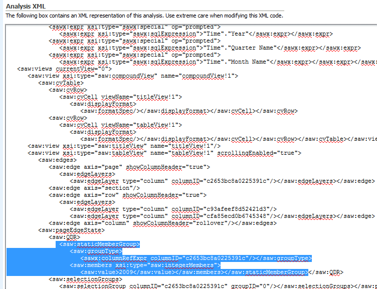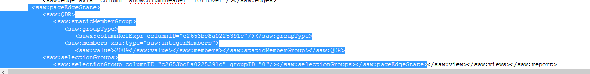 If you still have a version of your initial report saved, and go to the Advanced tab to study the report’s XML, you will notice this report has no section/tag called ‘staticMemberGroup’.